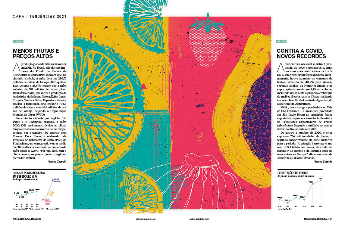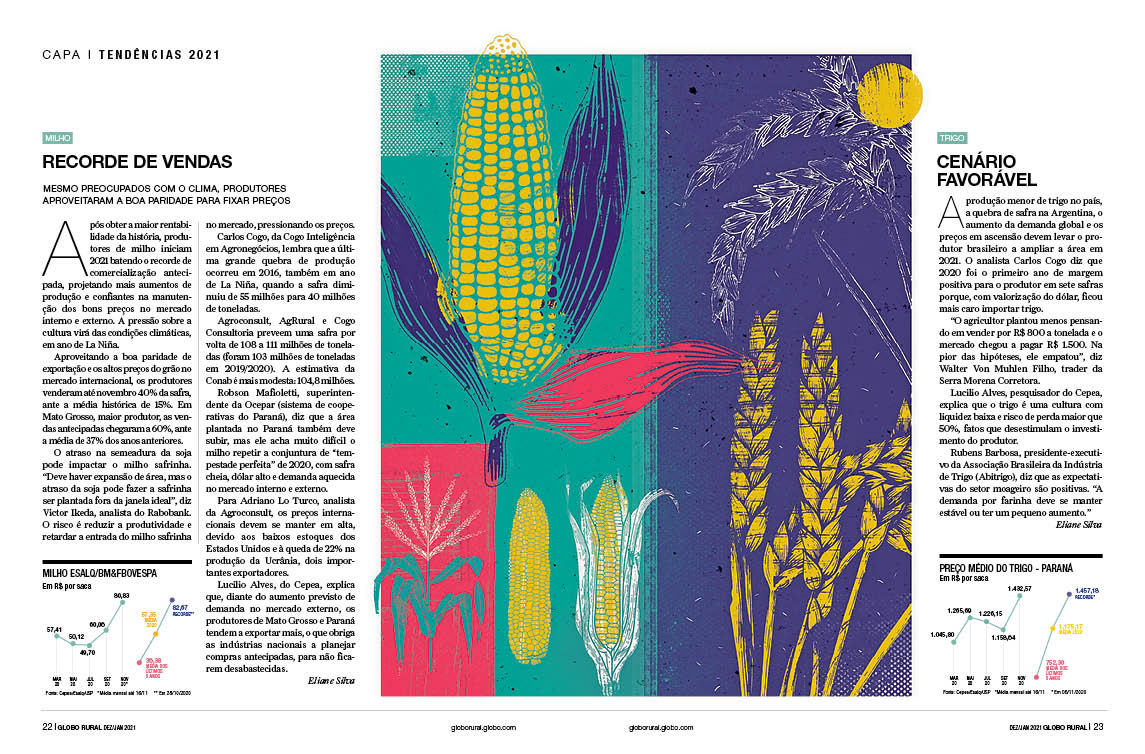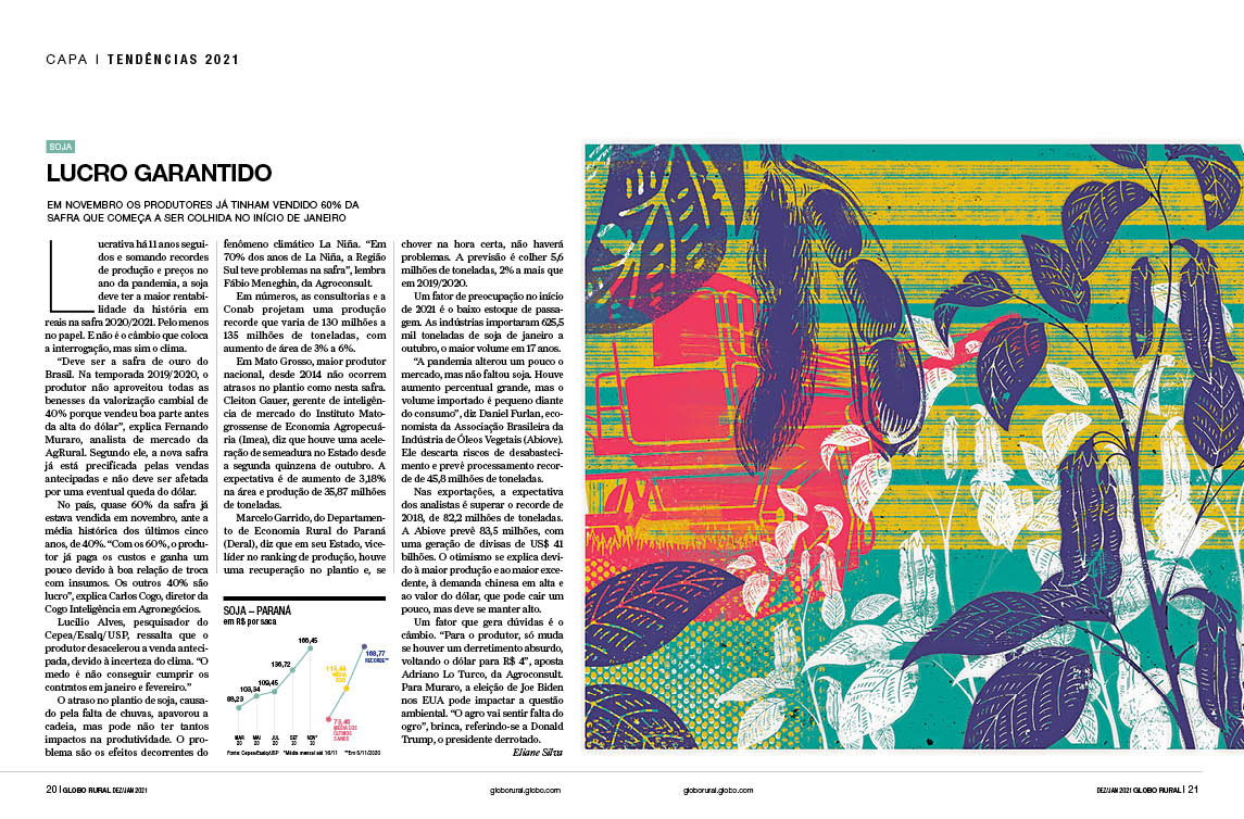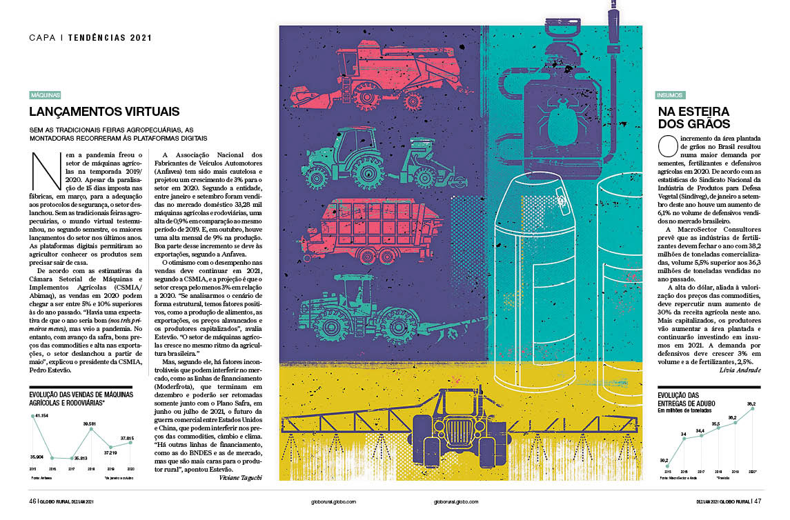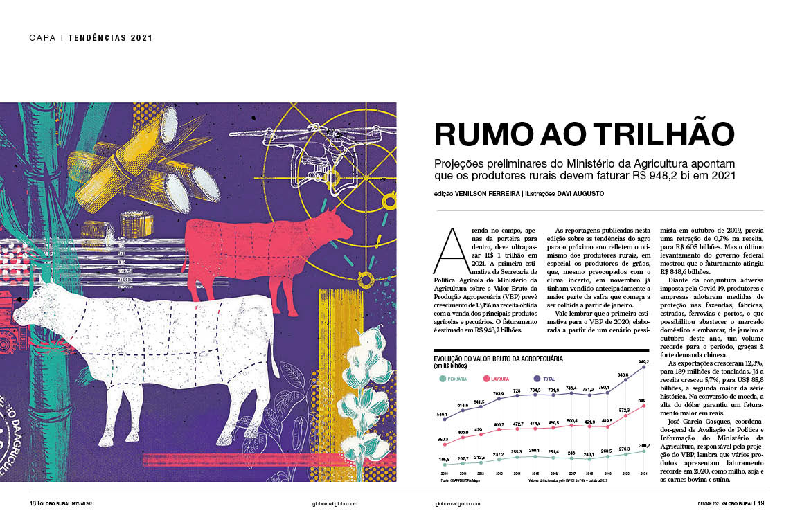 Especial da revista Globo Rural sobre as tendências do agropecuário 2021 Verúcio Ferraz - direção de arte Davi Augusto - Ilustrações